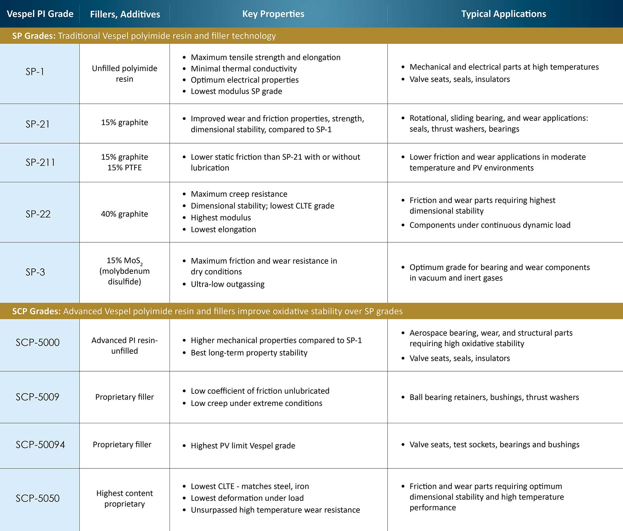 Vespel SP 牌號是 50 多年來指定的傳統 PI 牌號,因為它們結合了摩擦和磨損性能、耐化學性、電氣性能、高強度和在低溫和極端高溫下的性能。Vespel SCP 牌號基於先進的聚醯亞胺和填料技術,可提高強度和抗熱氧化性。